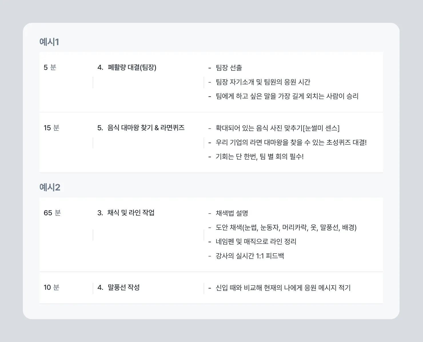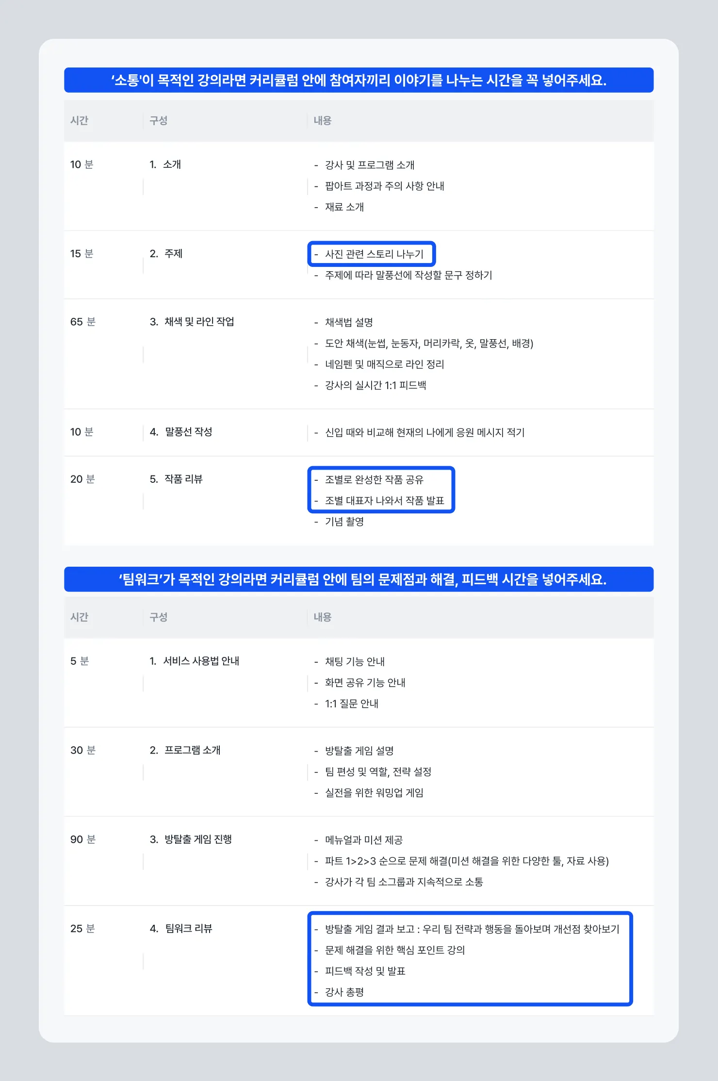 - 기업 강의에 맞춰 워크샵 목적이 잘 드러나도록 구성해주세요.