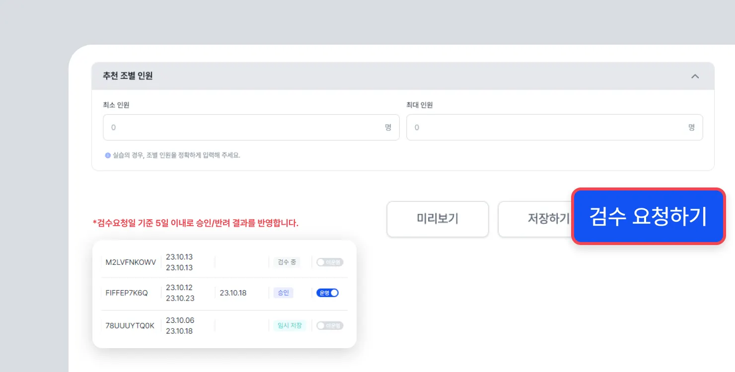 - 등록을 마친 후에는 꼭! 검수 요청하기를 클릭해주세요.