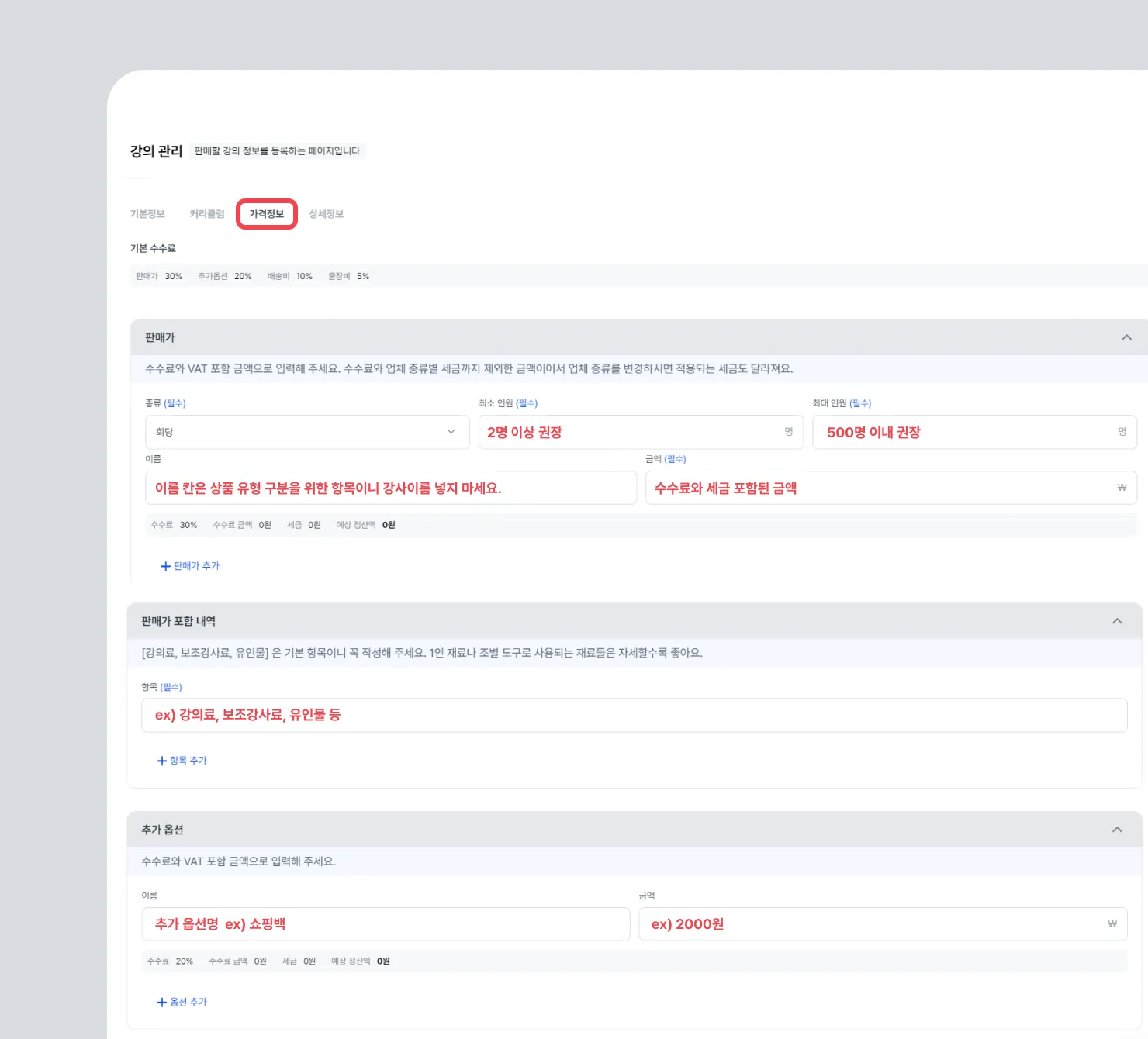 - 판매가 포함내역에는 강의 진행시, 기본 제공하거나 활용하는 품목을 모두 적어주세요.