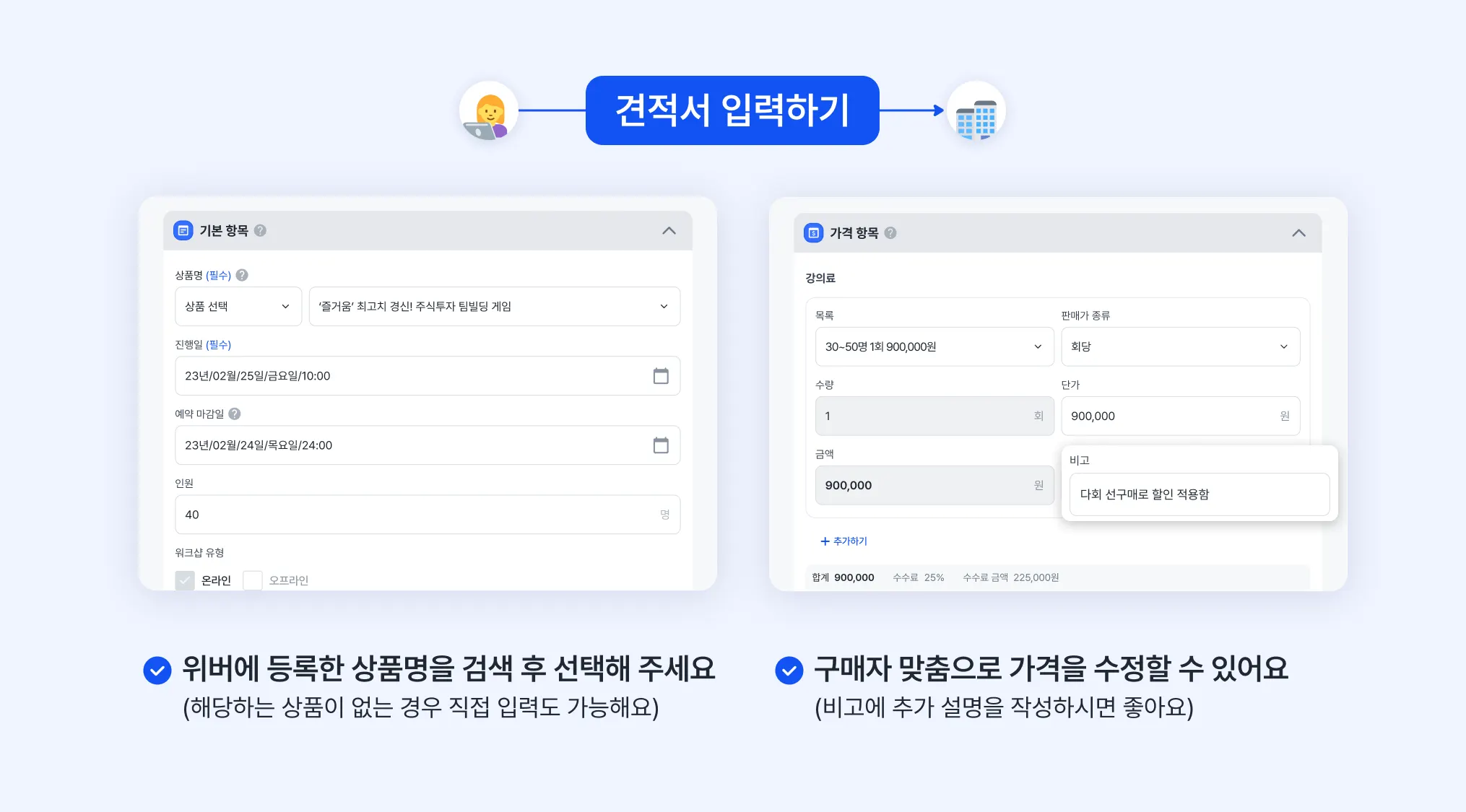 견적서는 구매자와 함께 공유하는 자료이니 결정된 사항은 바로 업데이트해 주세요. (예시 : 인원, 장소 등)