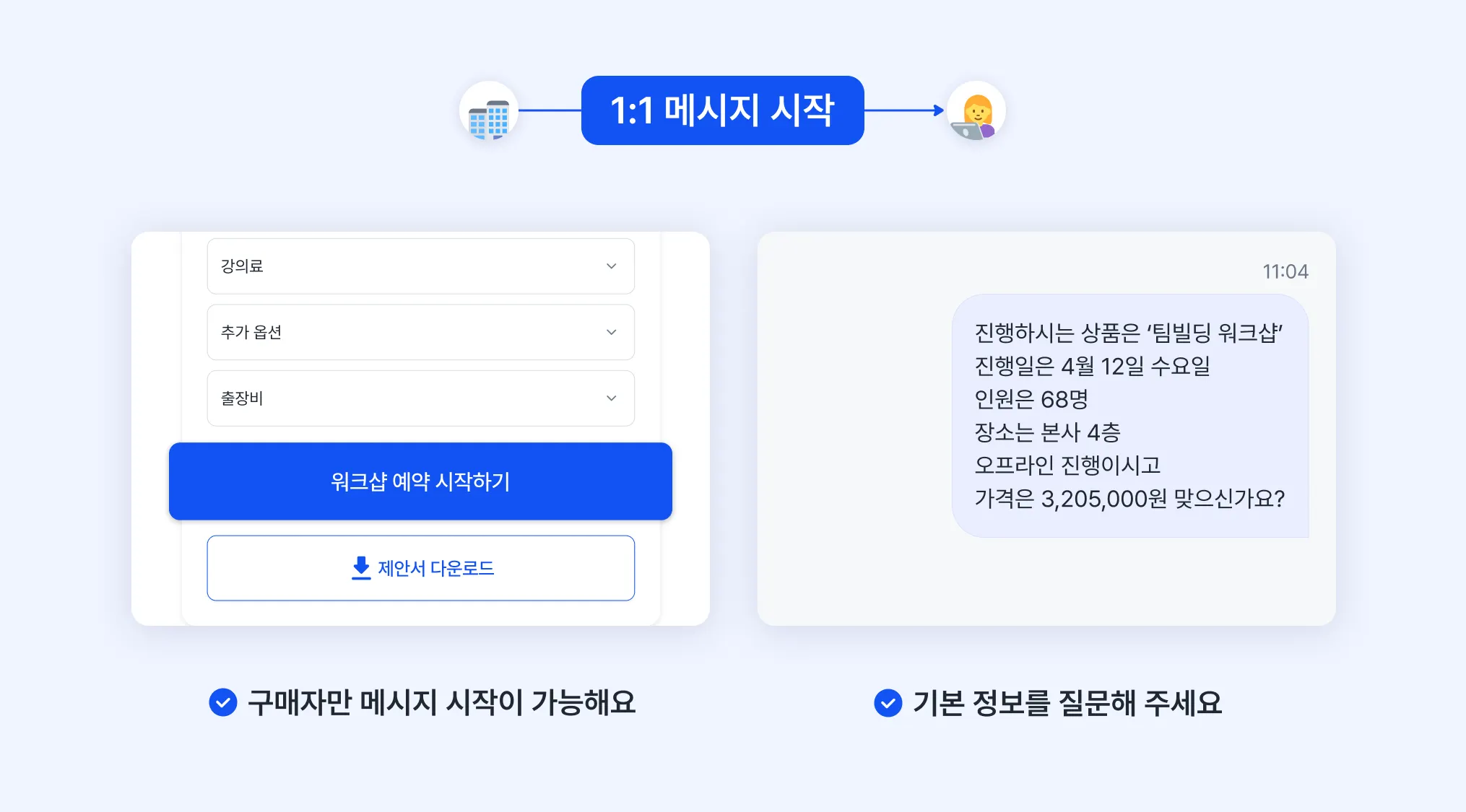 상품 페이지에서 구매자가 메시지를 시작합니다.