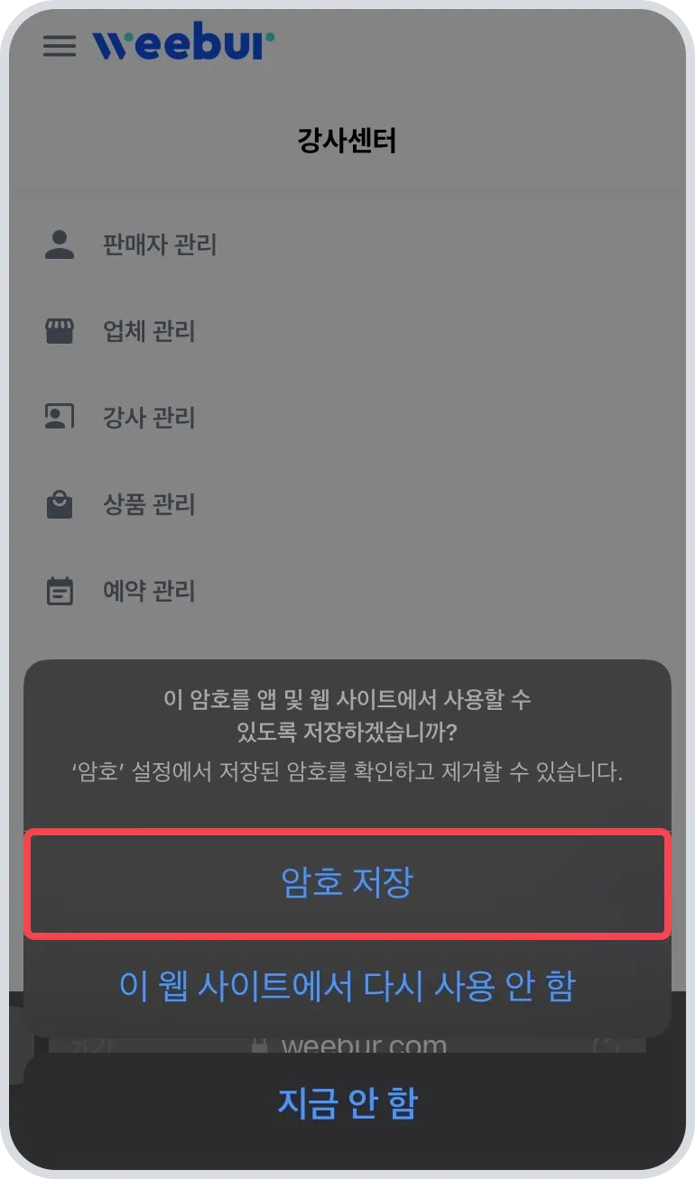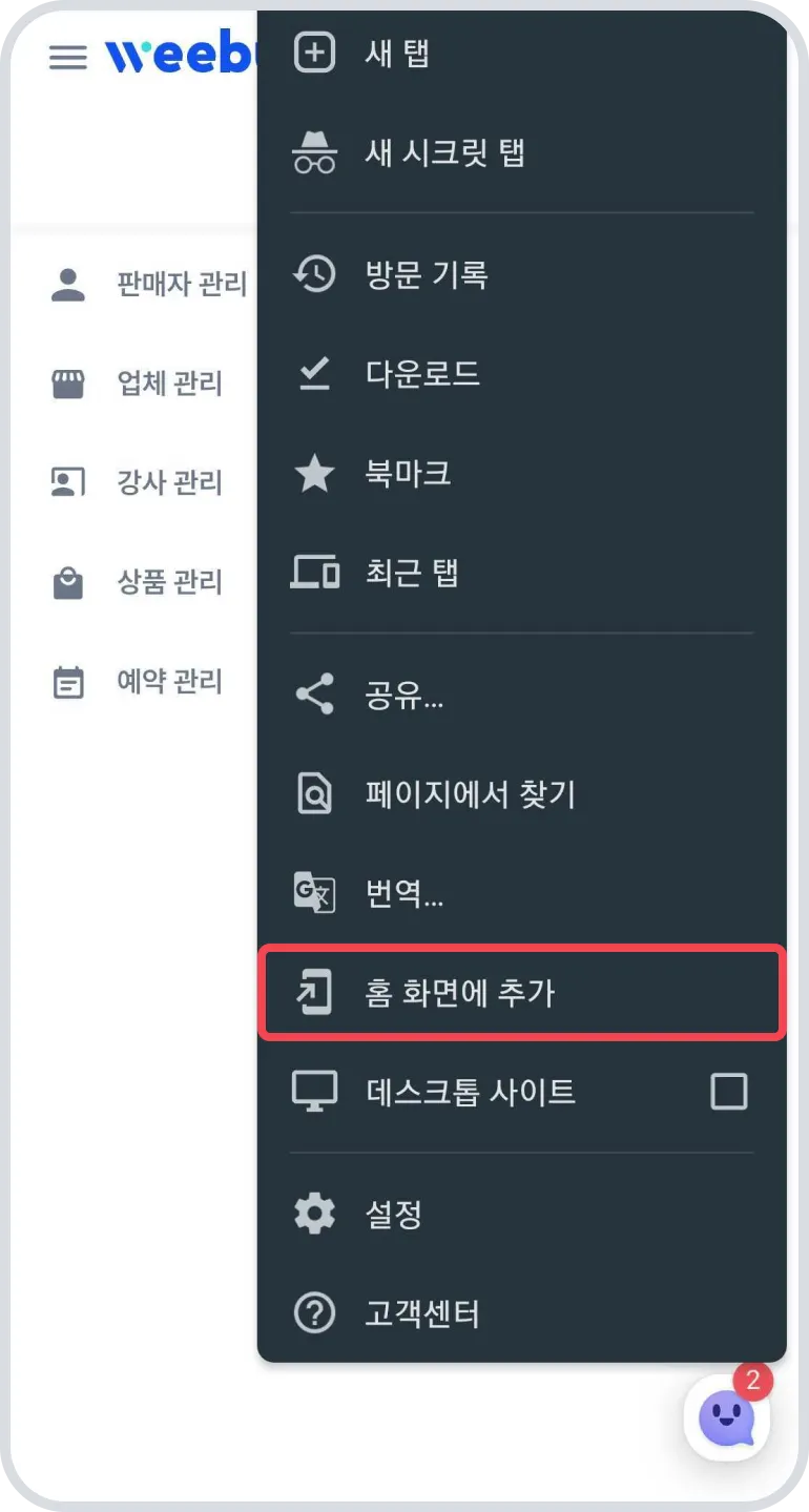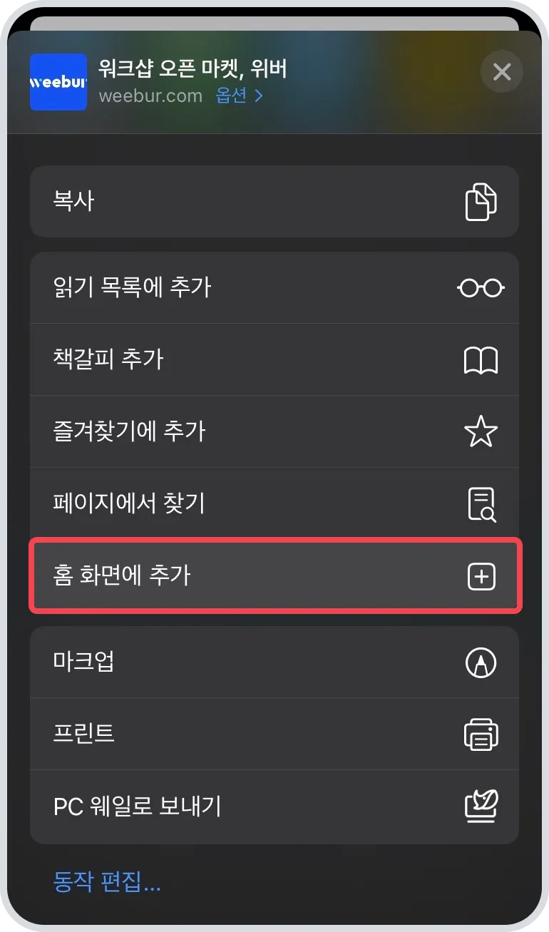 홈 화면에 추가로 위버 홈페이지를 추가하시면 더 원활하게 접속 가능합니다.