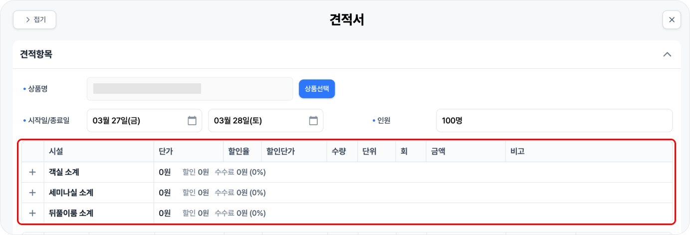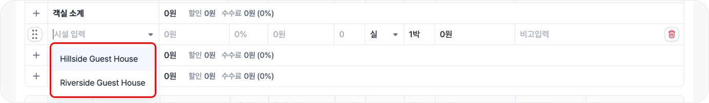 상품에 등록한 시설 유형이 표에 세팅되어 있어요.