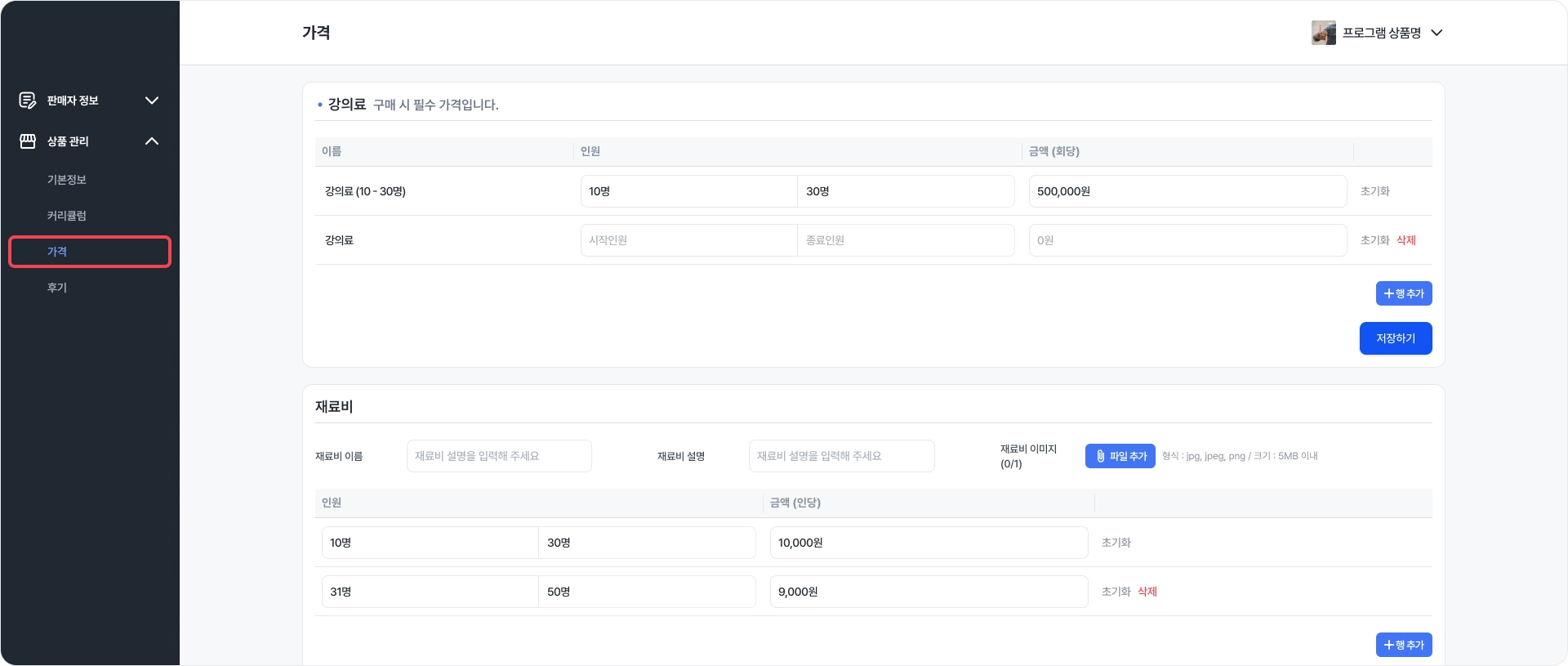 기존 1인 판매가로 운영하던 재료비가 있는 상품 (예: 1인 3만원)