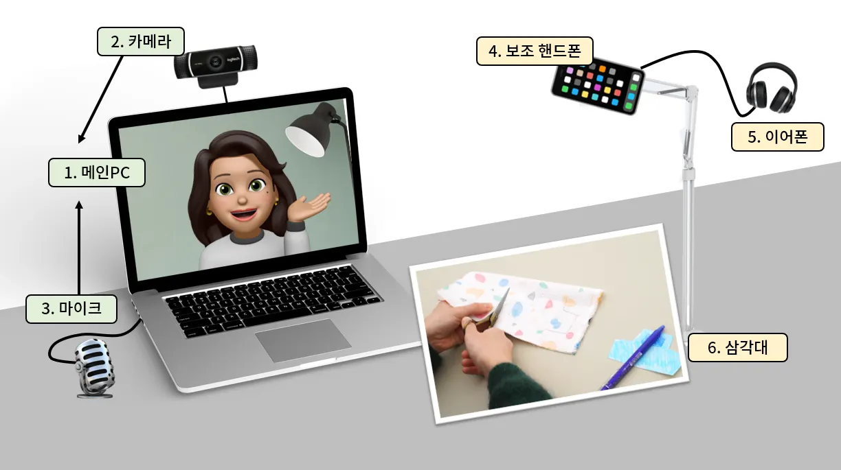 마이크/카메라/화면공유가 원활한지 보조기기로 직접 보고 들으며 셀프 체크합니다.